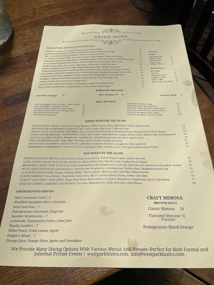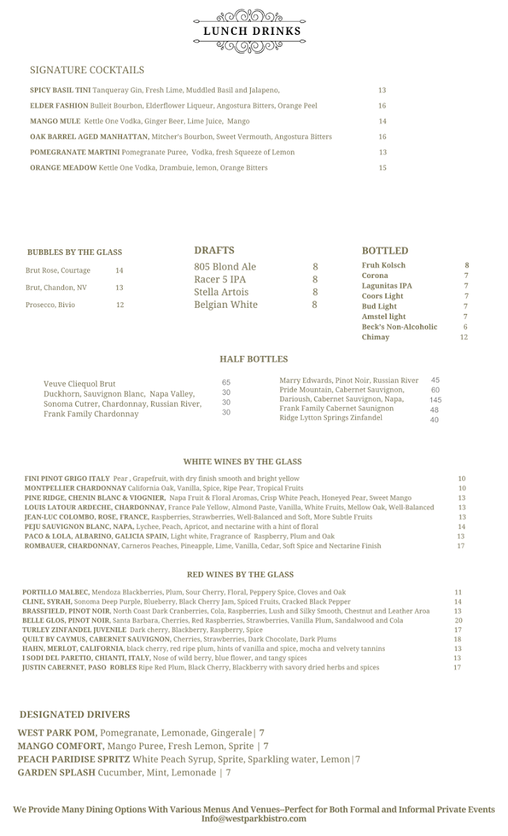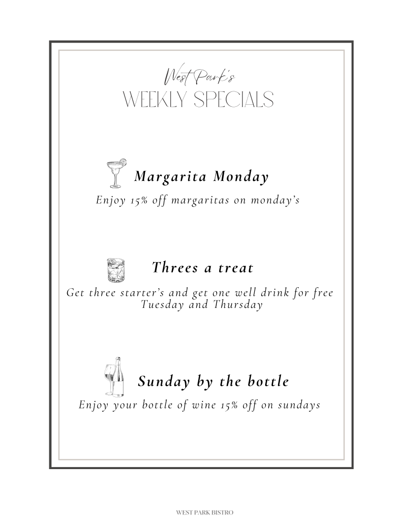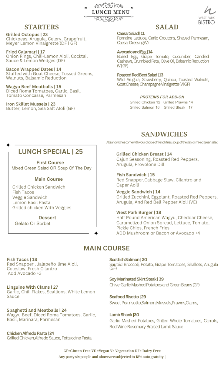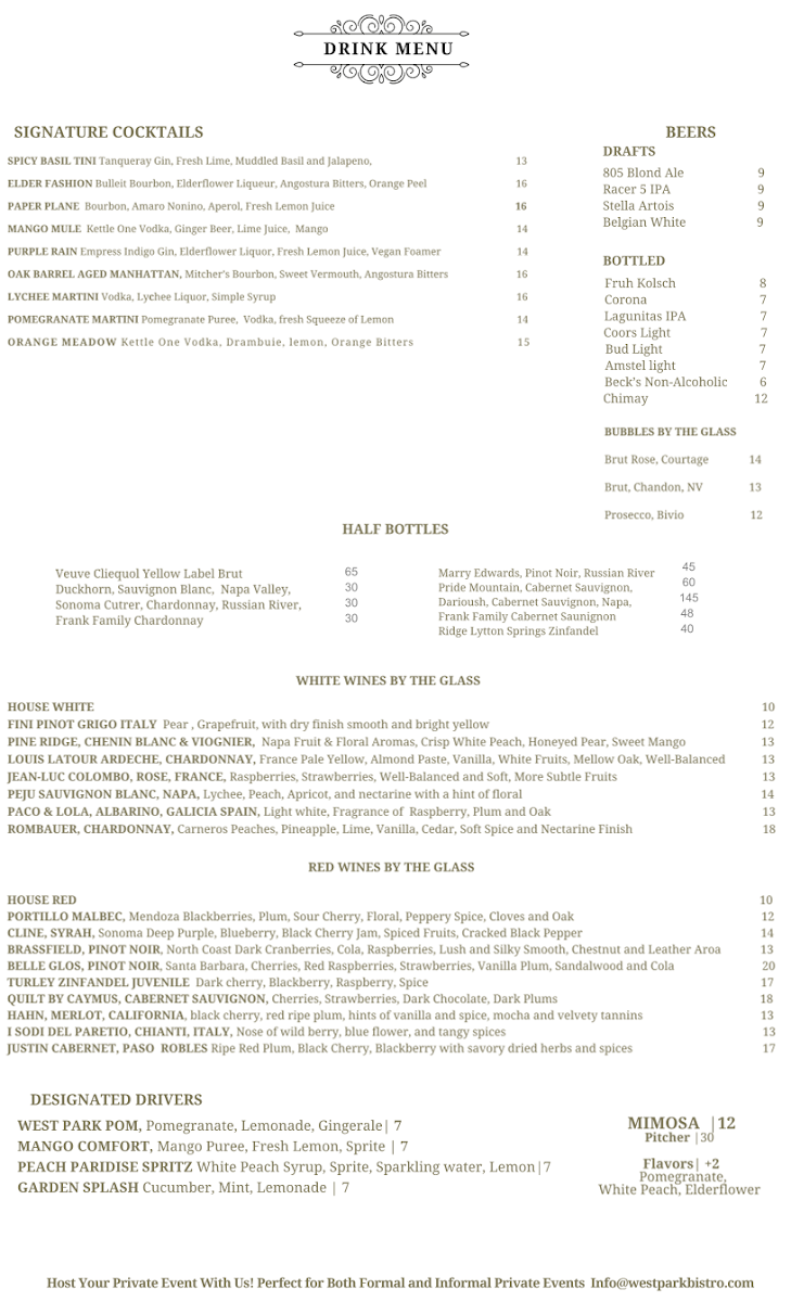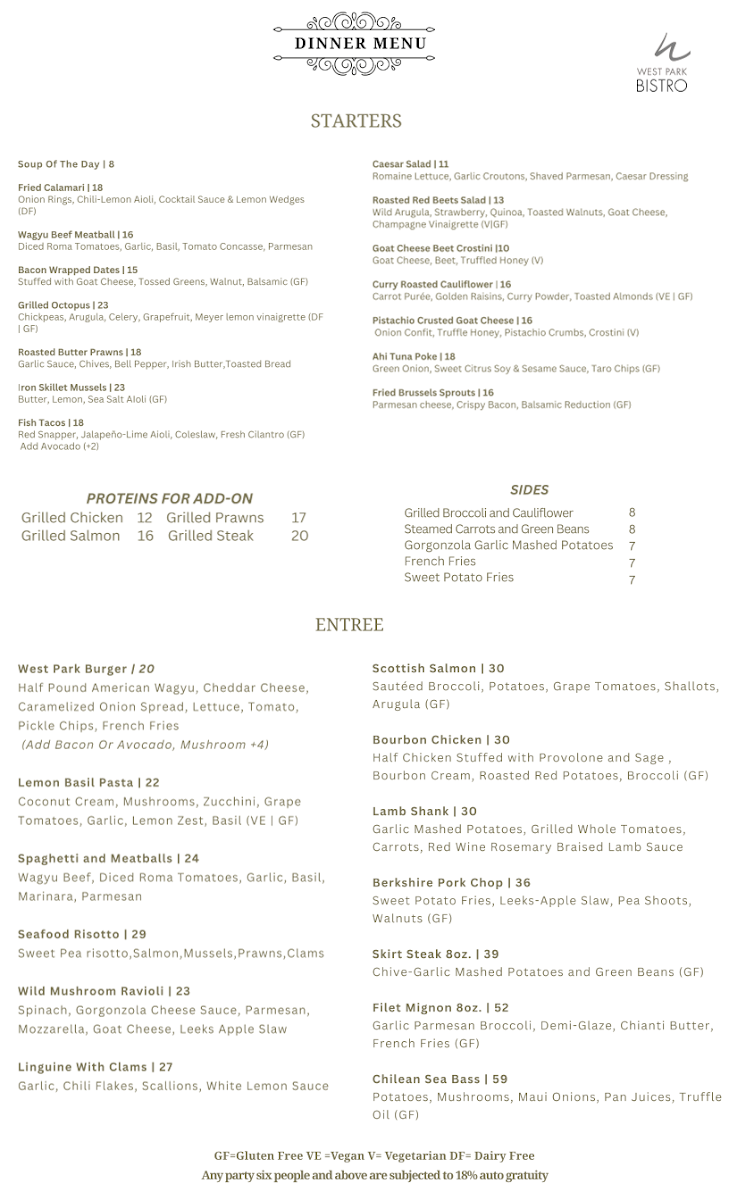 At West Park Bistro Menu, you'll find a delightful mix of flavors and fresh ingredients that make every meal special. Nestled in the heart of San Carlos, this charming spot offers an inviting atmosphere where you can unwind with a variety of delicious dishes. Whether you're in the mood for something light and refreshing or a hearty, satisfying meal, the menu has something to please every palate. Each dish is crafted with care, ensuring the perfect balance of taste and presentation. From vibrant salads to savory entrees, every option brings something unique to the table. Enjoy your dining experience with options that cater to a variety of preferences, all served with a side of warmth and hospitality.